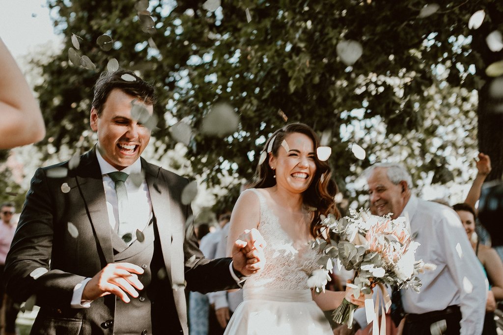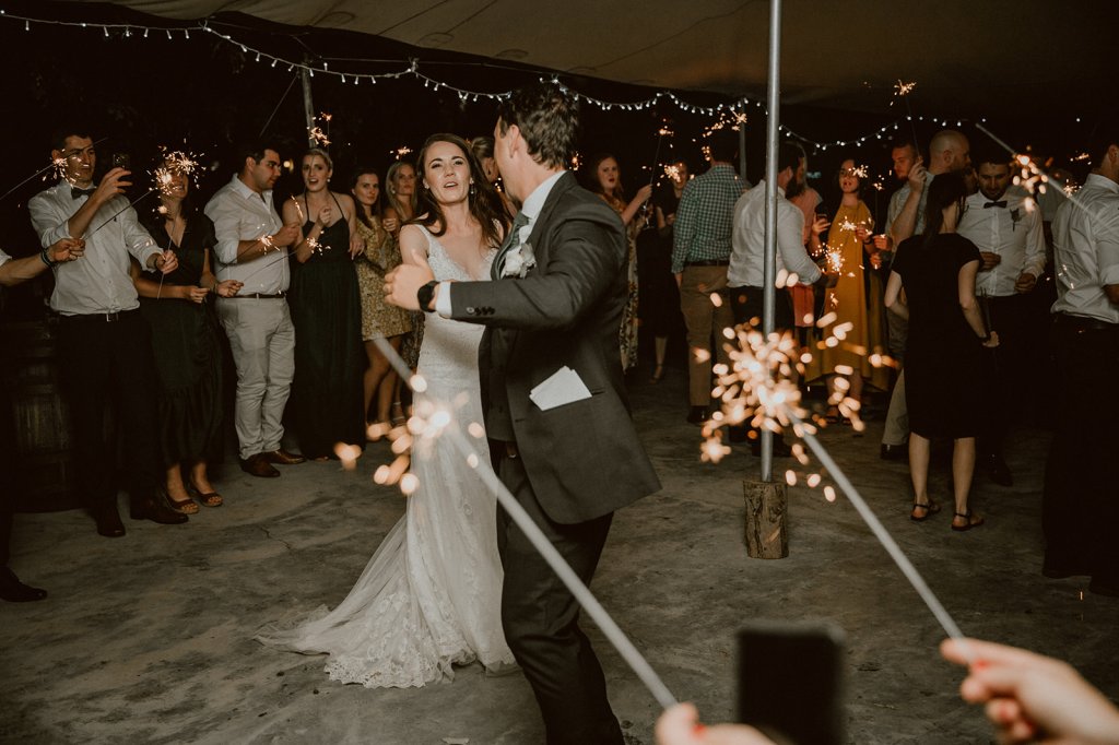 Their ceremony unfolded beneath the sprawling oak trees of La Terra de Luc. The wind picked up and a few umbrellas flew over the lawn during canapés, but later the weather settled, treating everyone to a beautiful evening of dancing outdoors.