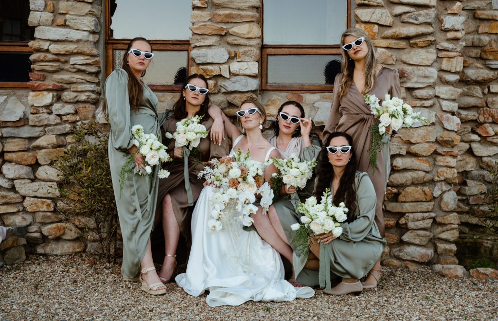 The bridesmaids had a blast popping champagne in the field and rocking funky sunglasses. A particularly fun moment I remember was later in the evening, when the dancing was in full swing, and all the bridesmaids synchronously put on their sunglasses for a song or two—it was such a vibe!